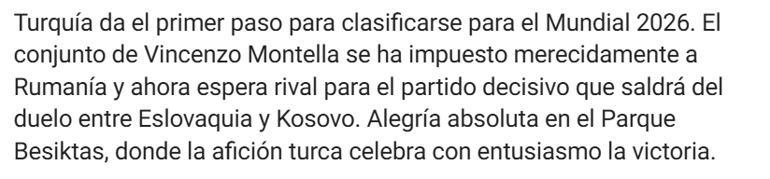 MARCA: Türkiye,2026 Dünya Kupası'na katılmak için ilk adımı attı. Vincenzo Montella'nın takımı,Romanya'yı haklı bir galibiyetle mağlup etti ve şimdi Slovakya ile Kosova arasındaki maçın sonucuna göre belirlenecek rakibini bekliyor. Beşiktaş Parkı'nda büyük sevinç yaşanırken,Türk taraftarlar bu zaferi coşkuyla kutluyor.