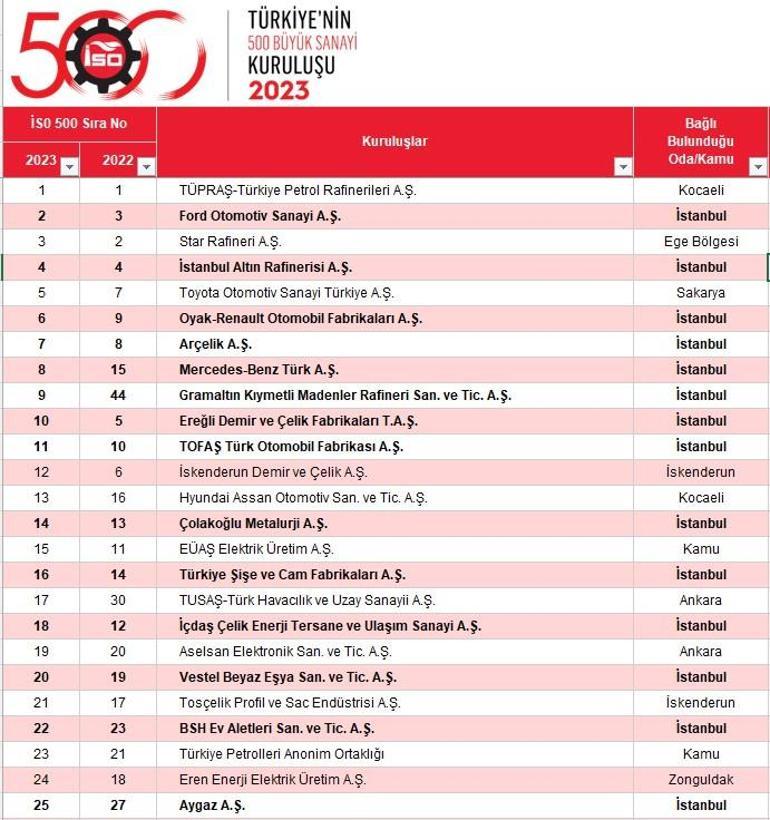 Tabloda da gördüğünüz üzere İSO 500’ün ilk 10’unda yer alan şirketlerde 2022 yılına göre iki önemli değişiklik oldu. Geçen yıl ilk 10’da yer almayan Mercedes-Benz ve Gramaltın Kıymetli Madenler ilk 10’a yükselme başarısını gösterdi.