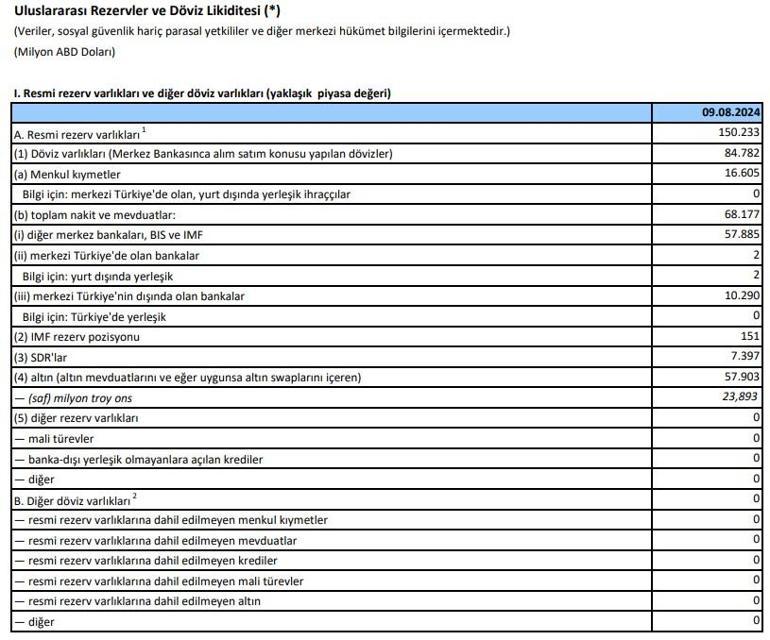 Türkiye Cumhuriyet Merkez Bankası haftalık rezervlerini açıkladı. Merkez\'in rezervleri 150 milyar 233 milyon dolara geriledi.