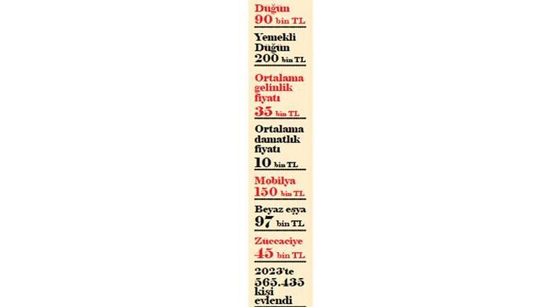 Ev kurmanın maliyeti ise çok daha fazla. Bu yıl en temel bazı ihtiyaçlar için minimum şu fiyatlar çıkıyor: Düğün 90 bin TL,yemekli düğün en az 200 bin TL,züccaciye 45 bin TL,mobilya 150 bin TL,beyaz eşya 97 bin TL.