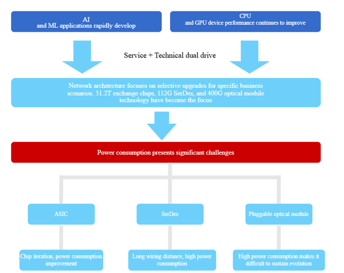 Driven by the dual imperatives of business needs and hardware innovation, the upgrading of the data centre network architecture is essential. To achieve this iteration, the technologies at three levels—switching chips, SerDes, and optical modules—must advance in a coordinated manner, as each component is integral to the overall process. It is evident that this trajectory of technological evolution will encounter numerous challenges, with power consumption being a particularly complex issue to address.