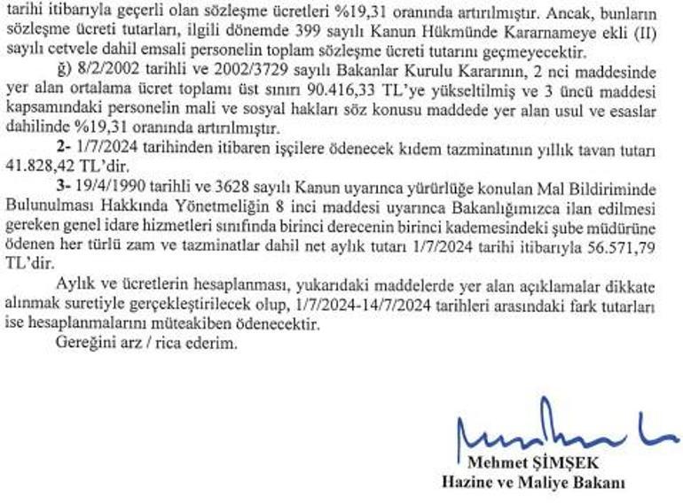 Hazine ve Maliye Bakanı Mehmet Şimşek,sözleşmeli personel,memur ve memur emeklilerine yapılacak olan zammı,kıdem tazminatı tavanını ve maaş farklarının hesaplanmasına ilişkin kararı imzaladı.