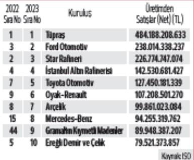 İSO 500 çalışmasında 2023’te üretimden satışlara göre en büyük kuruluş,484 milyar liralık satış ile Tüpraş oldu. Bu kuruluş,uzun yıllardır sürdürdüğü liderliğini 2023’te de korumuş oldu. 2023’te üretimden satışlara göre ikinci büyük kuruluş 238 milyar lira ile Ford Otomotiv olurken; üçüncü sırada ise yaklaşık 227 milyar liralık üretimden satışla Star Rafineri yer aldı. TOGG da ilk kez devler listesine girdi; ISO 500’de 42. sırada yer aldı. Şirketin net satışı 24 milyar 345 milyon 916 bin 198 TL olarak gerçekleşti.