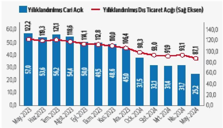 Merkez Bankası’nın mayıs ayı cari denge verileri,beklenenin üstünde düşüşe işaret etti. Buna göre mayısta cari açık 1.24 milyar dolar oldu. Yıllıklandırılmış cari açık ise 25.2 milyar dolar olarak kaydedildi. Verileri değerlendiren Hazine ve Maliye Bakanı Şimşek,“Cari açık önemli bir sorun olmaktan çıkıyor” yorumunu yaptı.
