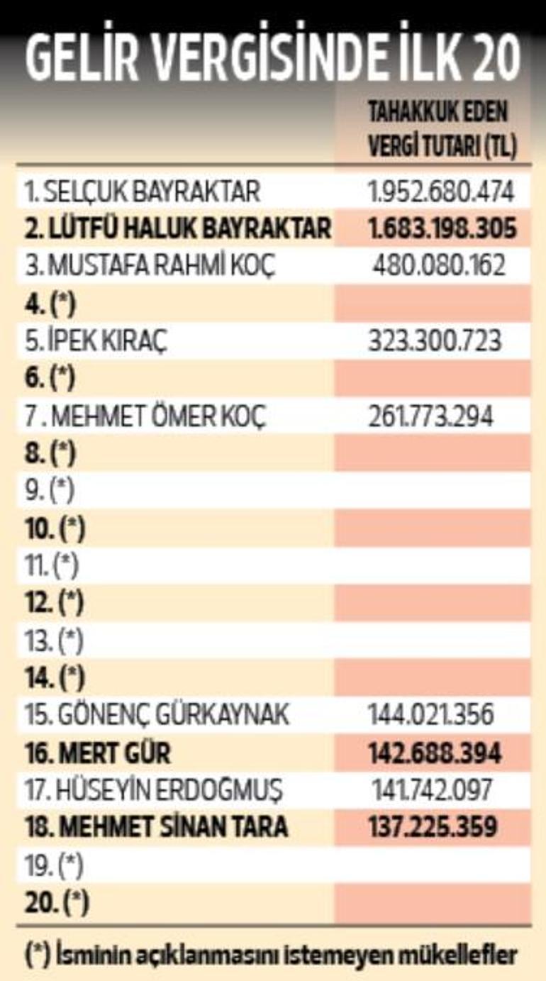 Türkiye’nin 2023 gelir vergisi rekortmeni Baykar Yönetim Kurulu Başkanı Selçuk Bayraktar olurken,ikinci sırada Haluk Bayraktar,üçüncü sırada Mustafa Rahmi Koç yer aldı. Listenin ilk 14’ünde sadece beş kişi ismini açıkladı. 100 kişinin yer aldığı listede 73 rekortmen ismini açıklamak istemedi. Kurumlar Vergisi’nde şampiyon ise Ziraat Bankası oldu