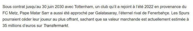 Sarr,2022 yılında Metz'den Tottenham'a transfer olmuştu ve Haziran 2030'a kadar sözleşmesi bulunuyor. Pape Matar Sarr'a,Fenerbahçe ile beraber Galatasaray da ilgi duyuyor.